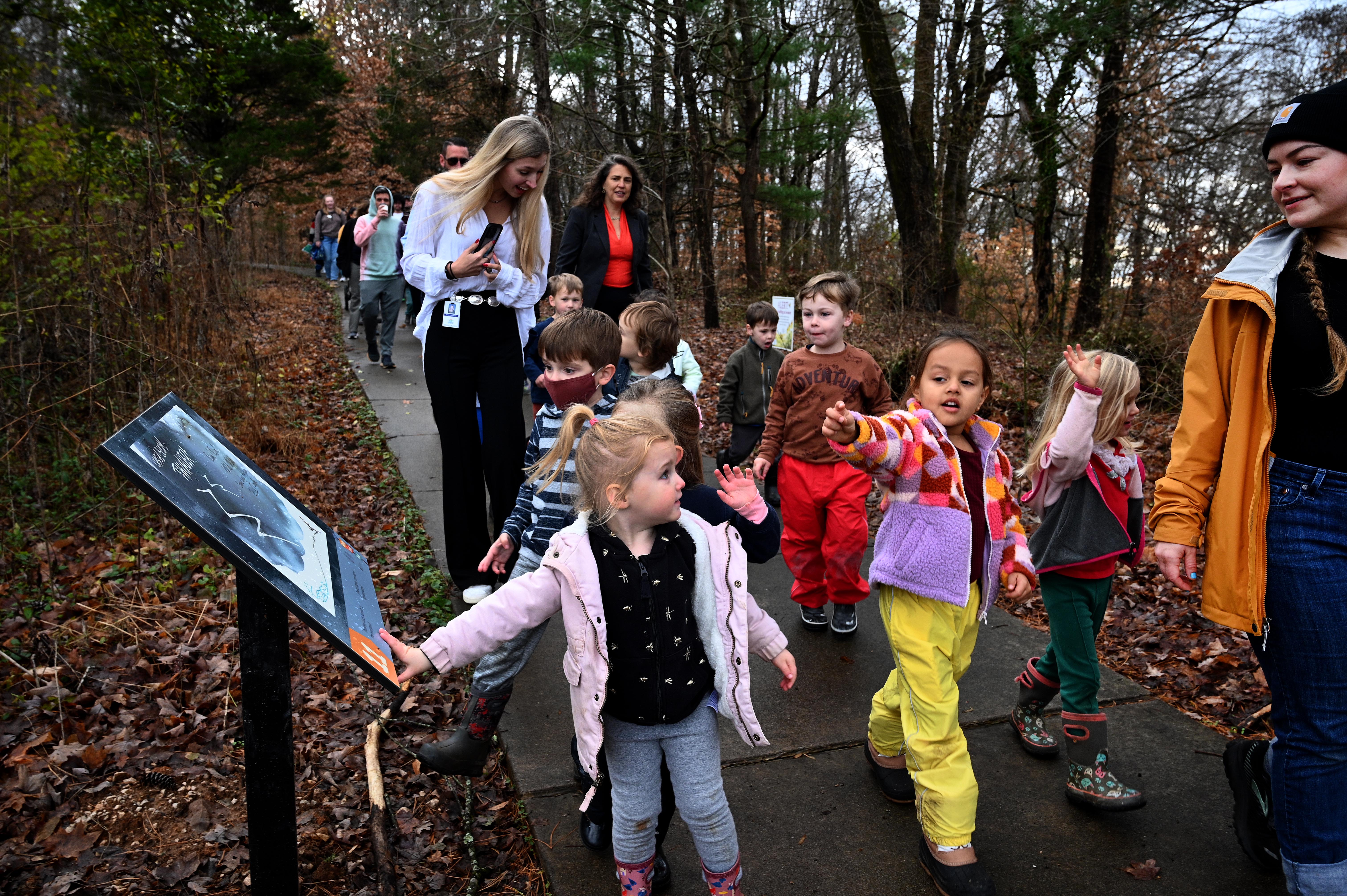 On November 30, 2022, Knox County Mayor Glenn Jacobs and City of Knoxville Mayor Indya Kincannon were joined by Senator Becky Duncan Massey, Commissioner Carson Dailey, Imagination Library of Knox County, and others to celebrate the installation of the permanent Knox County Public Library Storybook Trail at Ijams Nature Center. In addition to leading dignitaries on a tour of their new trail, Ijams preschool students enjoyed leaf printing, discovering animal artifacts, and creating nature journals.