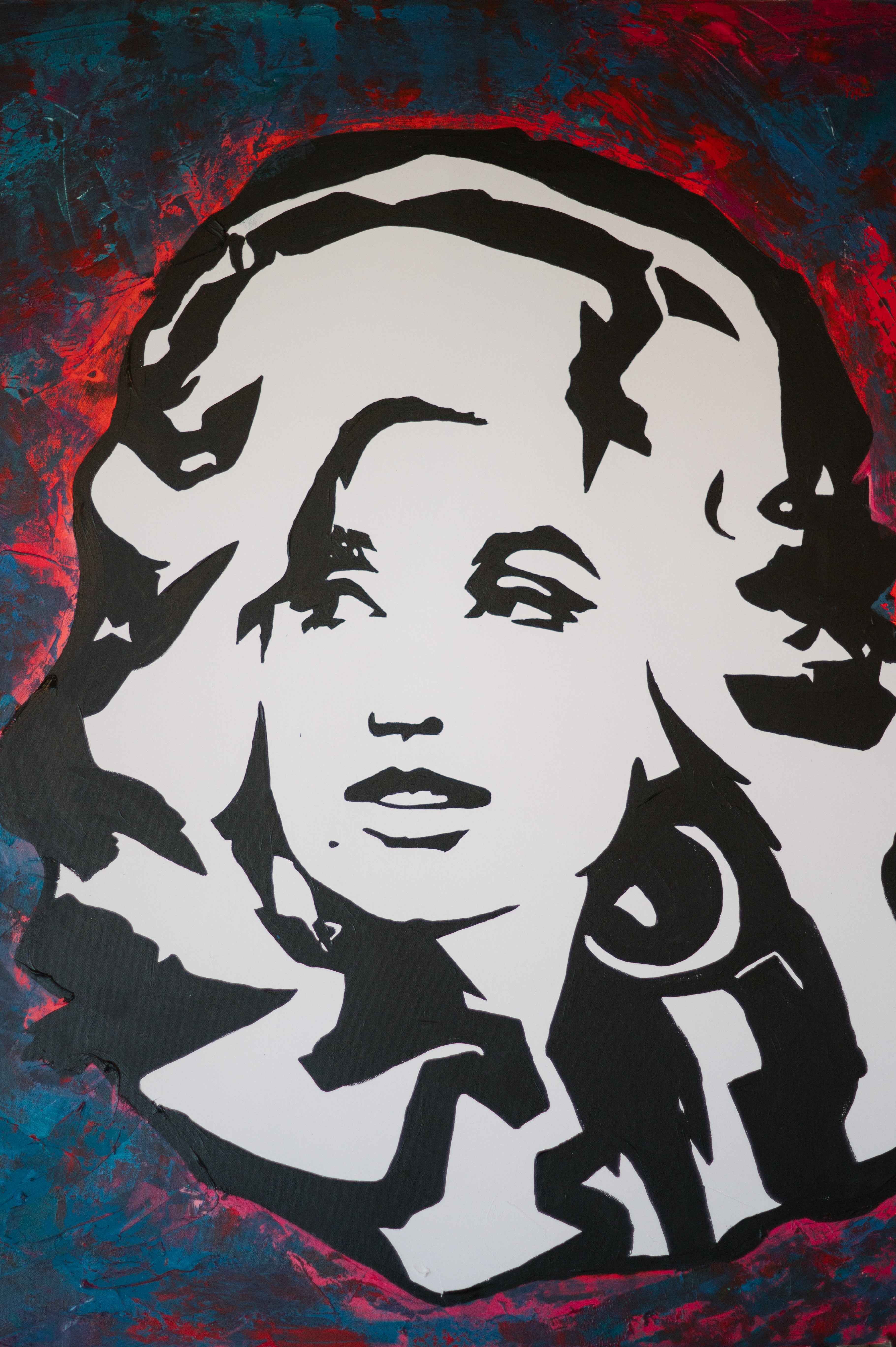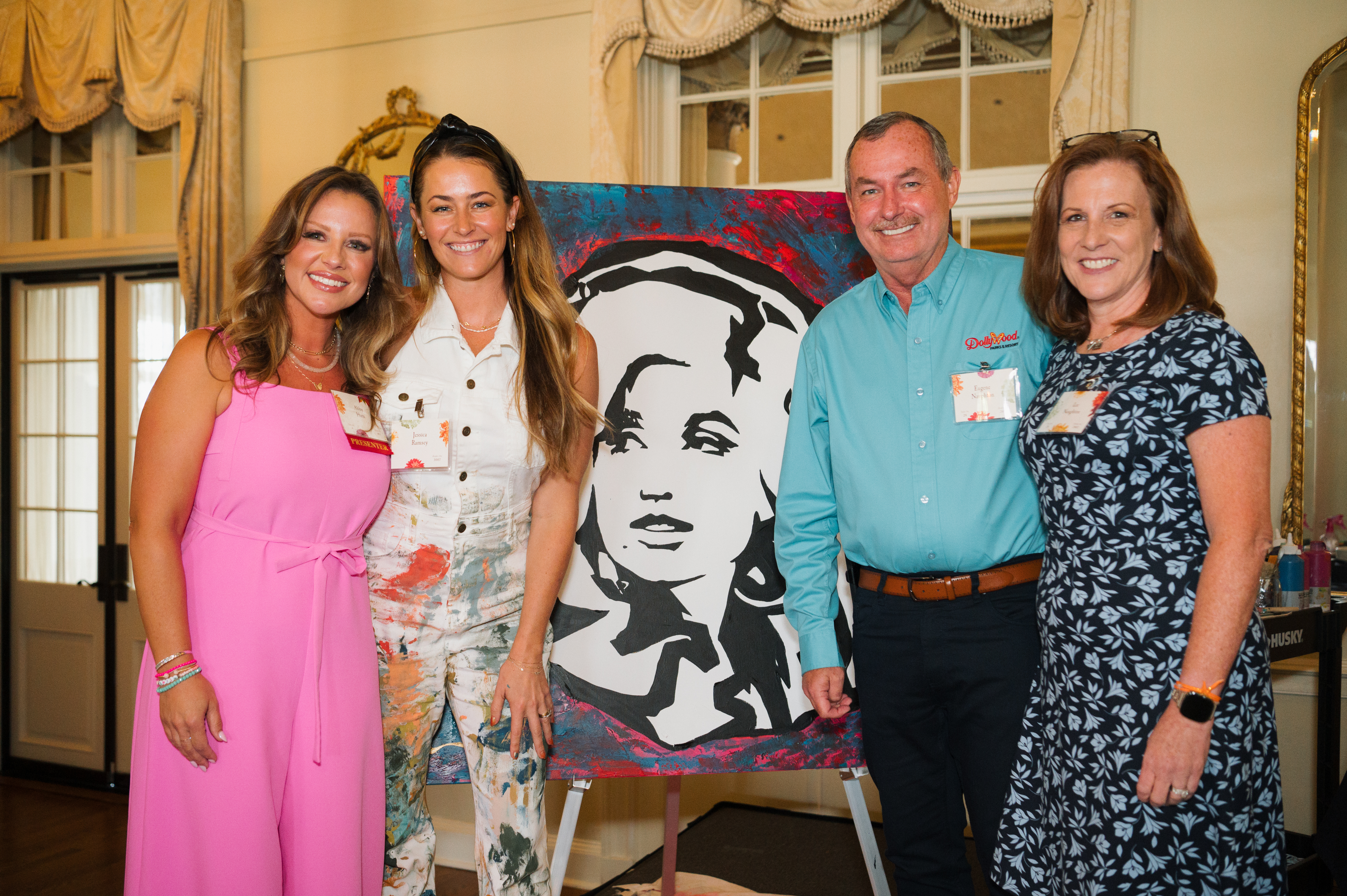 The other big highlight of the event was a live auction of Jessica Ramsey's Dolly Parton painting. Pictured here is the finished painting! From L to R: Abby Ham, emcee and friend of the artist; Jessica Ramsey, artist; Eugene Naughton and Lee Naughton, winners of the auction.
