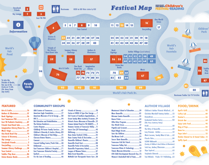 The Children's Festival of Reading is committed to making our event accessible to everyone, in accordance with Section 504 of the Rehabilitation Act of 1973 and The Americans with Disabilities Act of 1990. Please contact Jennifer Harrell (jharrell@knoxlib.org or (865) 215-8713) if you require special accommodations to make your visit to the Festival the best it can be.