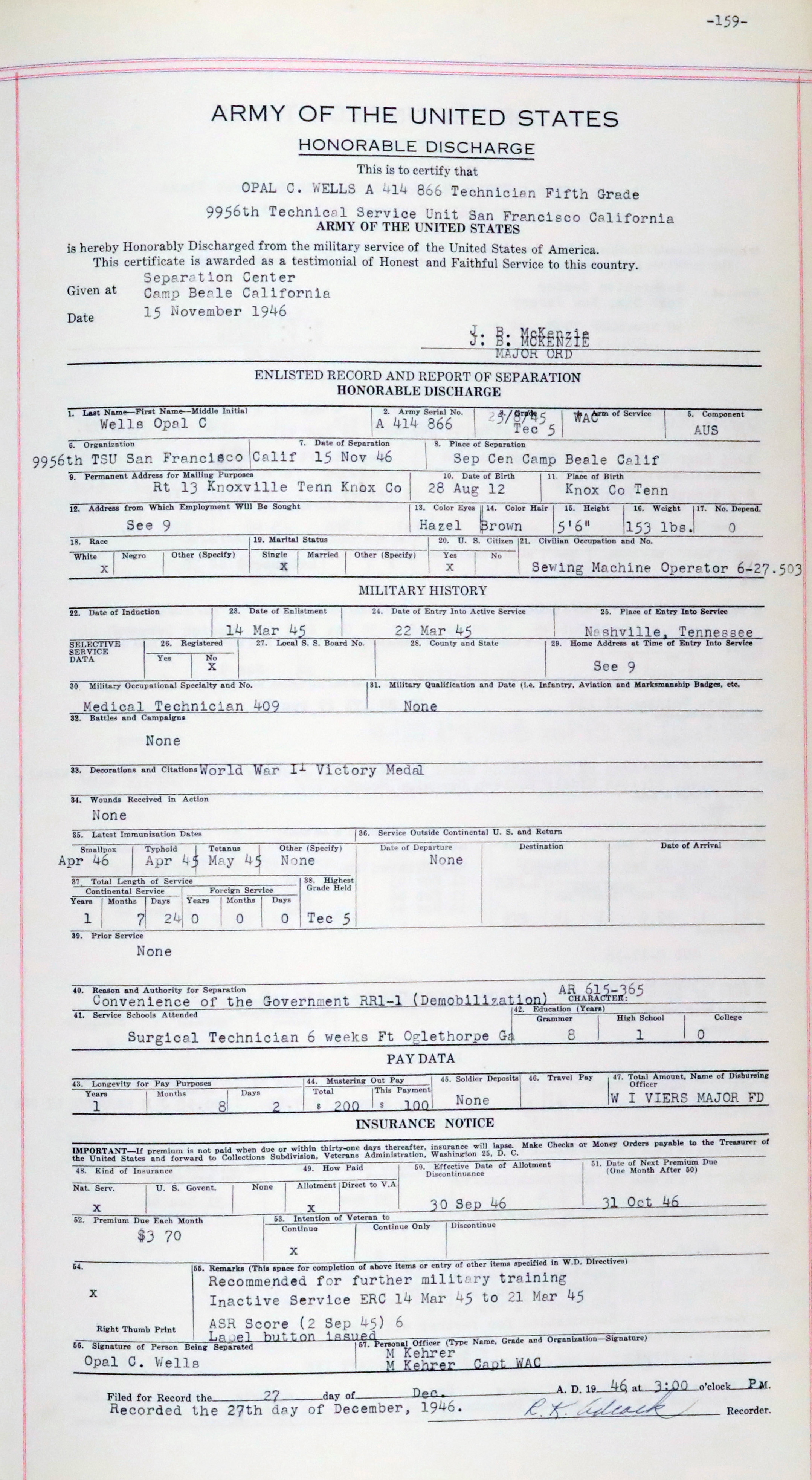 Opal Wells Wayland was born to William R. and Annie Graybeal Wells in Knox County on August 28, 1912. She attended Halls High School after which she not only worked as a sewing machine operator at Standard Knitting Mills but also took lessons at the Tennessee School of Beauty. In March 1945 during the closing months of World War II, Wells enlisted in the Women’s Army Corps in March 1945 and was trained to serve as a surgical technician for six weeks at Fort Oglethorpe, Georgia. She was then transferred to the 9956th Technical Service Unit inSan Francisco, California, where she served as a medical technician until her discharge in November 1946.