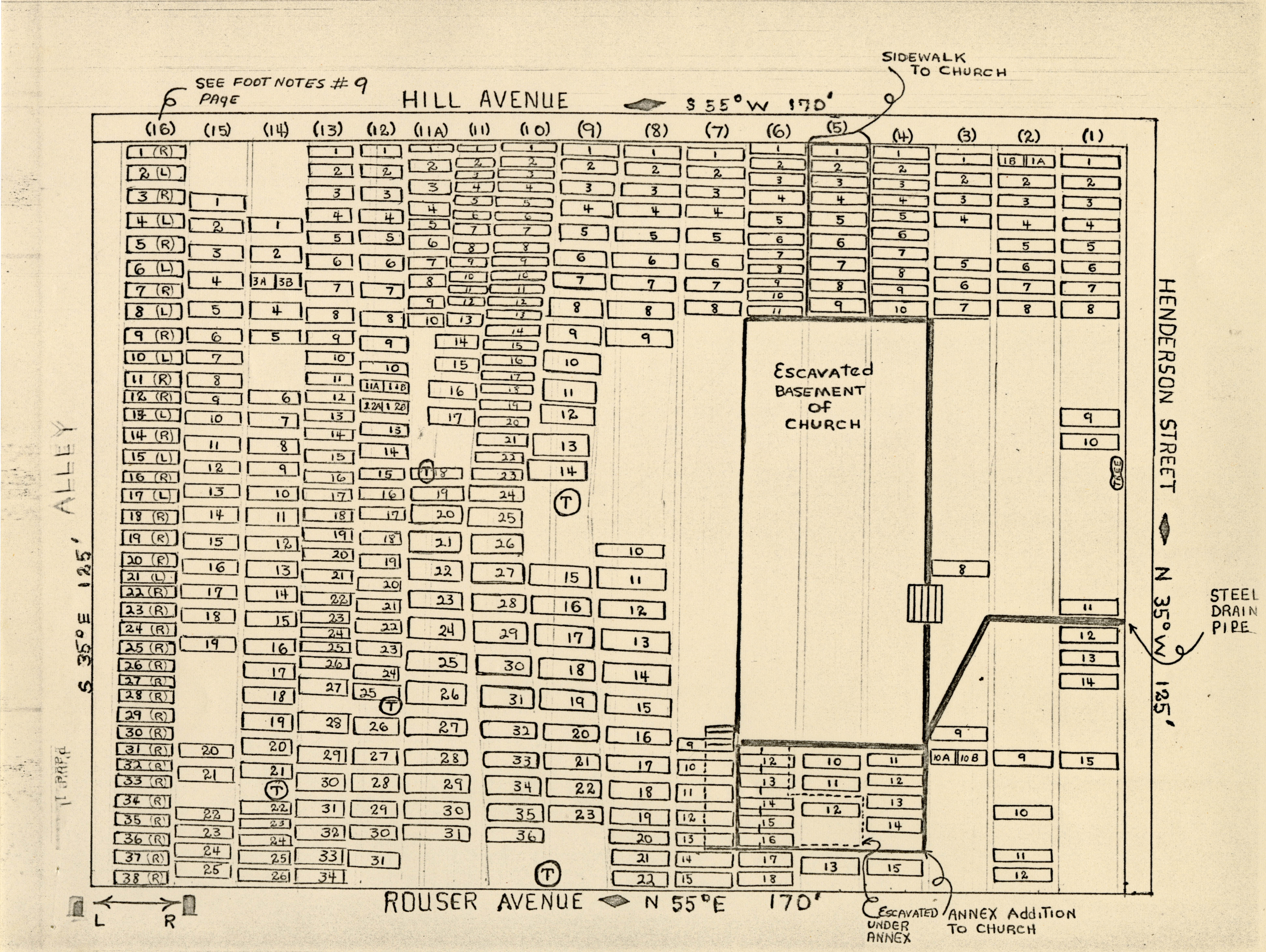This church operated until June 1963 when the Holston Conference voted to abandon the church due to dwindling attendance. The decision was probably precipitated by the fact that the church lay right in the middle of the Knoxville Housing Authority’s Mountain View Urban Renewal Project. On April 14, 1967, the church and KHA agreed to a sale price of $27,600 for the church and graveyard with $5,000 set aside to remove the suspected 15-25 graves in the cemetery. It was decided that Ed Berry of Berry Morticians would exhume the graves and eventually relocate them to Woodlawn Cemetery in South Knoxville. Mr. Berry began the operation by using a backhoe to remove the top layer of dirt, then hand shoveling remains into reburial containers. When all was said and done, Berry found at least 380 burials in this small graveyard including evidence of mass burials. The discovery of so many additional burials ballooned the cost of reburial from $5,000 to $73,500. The East Hill Methodist graveyard was successfully repositioned to a hill within Woodlawn, marked with only a single marker for the whole cemetery.