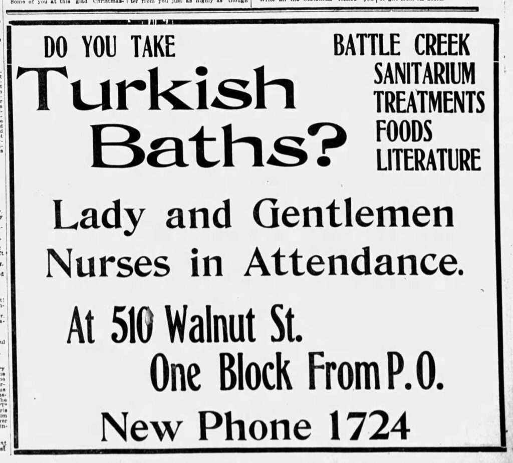 The business flourished on Walnut Street for about four years, and it eventually also opened a dining hall offering “Battle Creek Sanitarium Health Foods” in addition to its Turkish baths and massages.