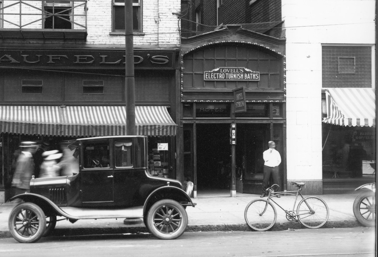 Lovell’s Electro Turkish Baths, 524 Gay Street. The white building on the right was the Farragut Hotel; today it is the Hyatt Place Hotel on the northeast corner of Gay Street and Clinch Avenue. (Calvin M. McClung Historical Collection)