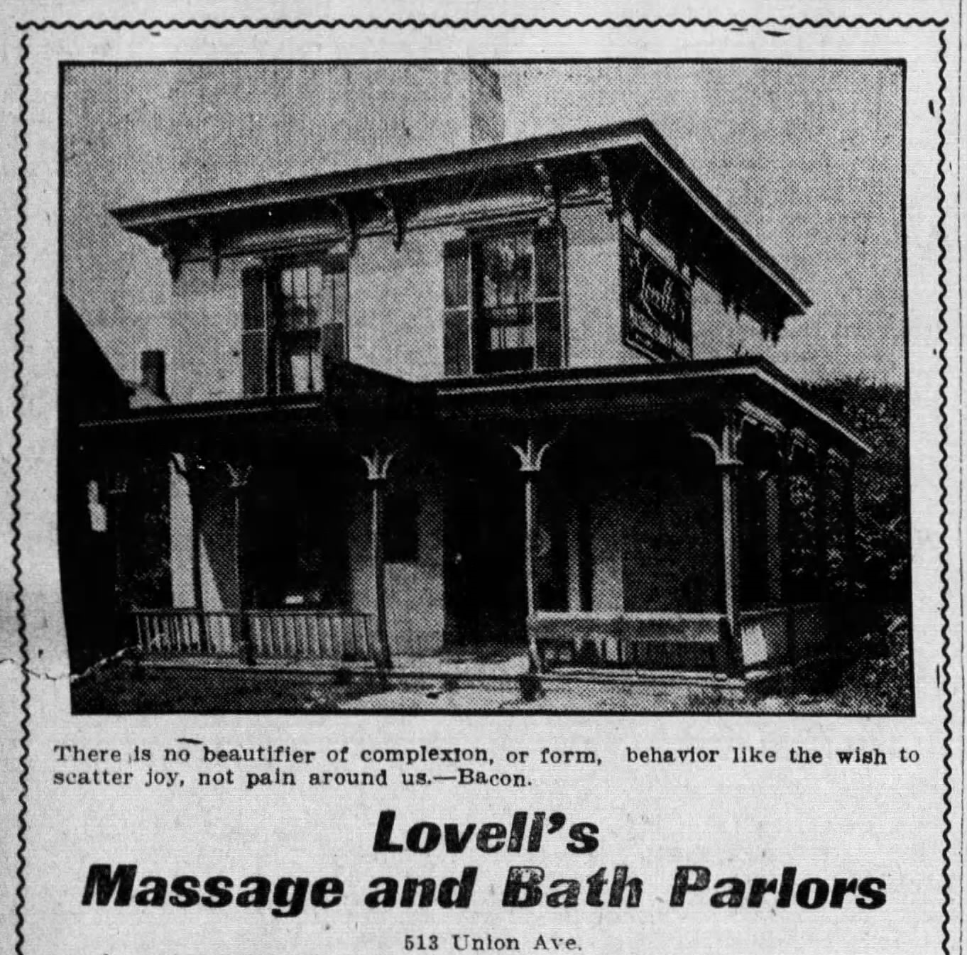 The following year, Raymond and Delia Lovell made a big change in their business that would soon affect their home life, as well. In June 1909, the firm of Doll, Mynderse & Brownlee advertised a building available for rent downtown at 513 Union Avenue. The first hint of an impending move was in July, when space in the New Sprankle building, “formerly used by Dr. Lovell,” was also advertised for rent. (It’s not clear whether either of the Lovells actually told anybody that they were doctors, or if somebody just assumed that one or both of them were, based on the type of work they did.) The Lovells made it official on August 24, 1909, announcing that the Turkish bath and massage business had moved from 510 Walnut Street to 513 Union Avenue. The new location was between Locust and Walnut Streets, on the west side of what had been a Girls’ high school around the turn of the century and what later became Boyd Junior High School. The Daylight Building later replaced the junior high school, and today there’s a parking lot where the Lovells’ business stood.