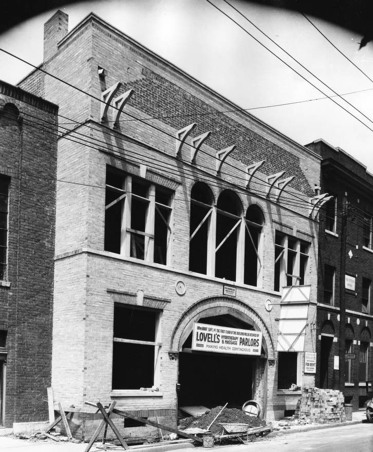Close-up view of the building at 507 Clinch Avenue under construction in 1926, with the Lovells’ banner in the entrance archway. (Calvin M. McClung Historical Collection)