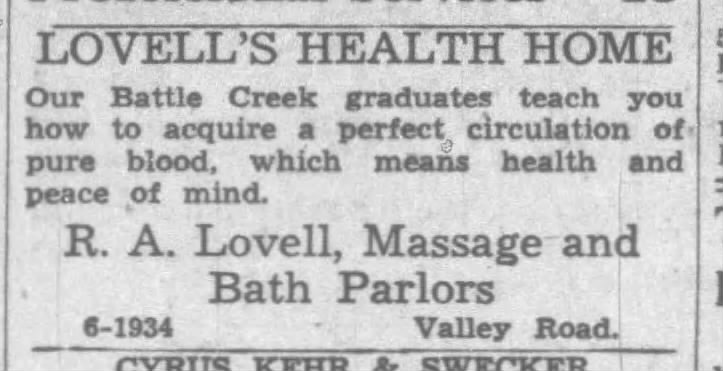 Meanwhile, into the 1930s, the Lovells continued to operate their business and offer their massage and bath parlor services from their Fountain City residence, under the name “Lovell’s Health Home.” In 1937, the street they lived on, Valley View Road, was renamed West Adair Drive, to differentiate it from two other Valley View Roads in Knoxville.