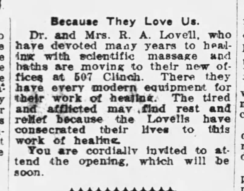 After the Lovells closed their treatment parlors at 513 Union Avenue and 524 Gay Street, they focused solely on their Fountain City home and on the Clinch Avenue location for nearly a decade. However, it seems that they closed their last downtown massage parlor around 1935, as no newspaper advertisements for the place ran beyond that year, and the 1936 city directory lists the address as a doctor’s office. The building is still there, at 507 West Clinch, a large block of brick, painted gray with an arched entryway, and it houses an accounting firm.