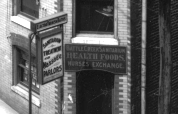 The entrance to Lovell’s treatment parlors at 510 Walnut Street, circa 1905. “Electro Turkish Baths; Sanitarium Treatment and Massage Parlors,” reads the free-standing sign. The sign above the door reads “Battle Creek Sanitarium Health Foods. Nurses Exchange.” (Calvin M. McClung Historical Collection)